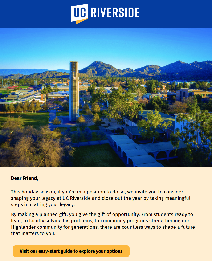 Browse past editions of our e-newsletter with stories, insights, and resources on creating a lasting legacy at UC Riverside.